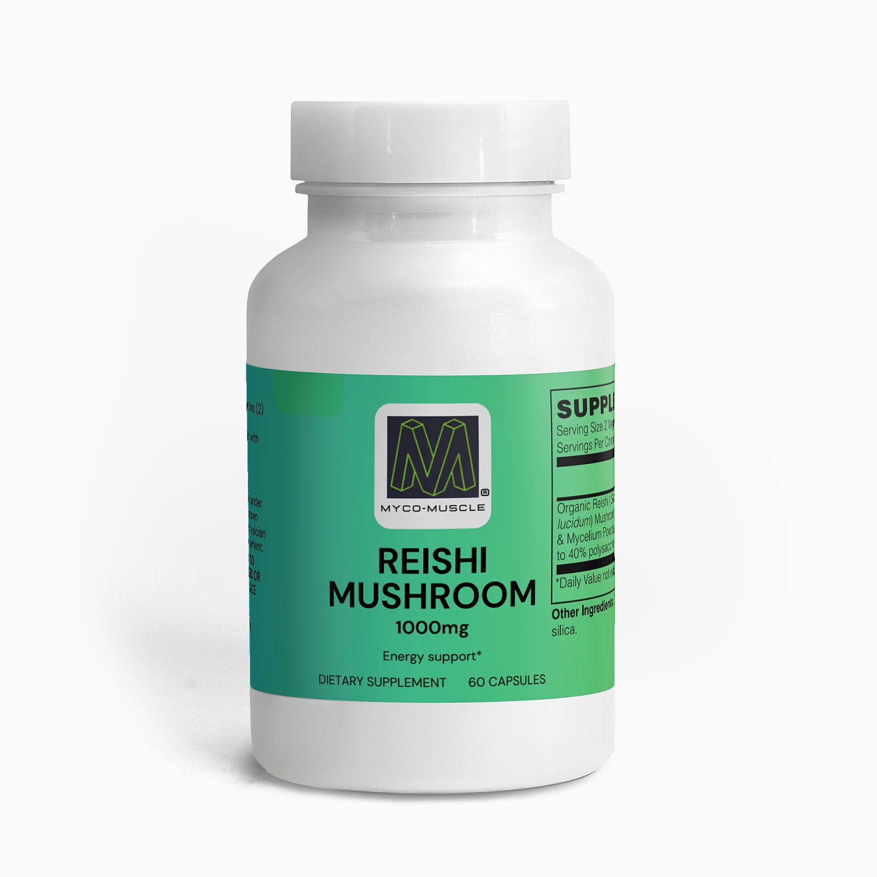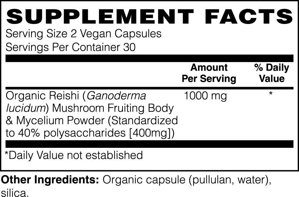 Ingredients: Organic Reishi (Ganoderma lucid) Mushroom Fruiting Body & Mycelium Powder (Standardized to 40% polysaccharides [400mg]), Organic capsule (pullulan, water), silica.